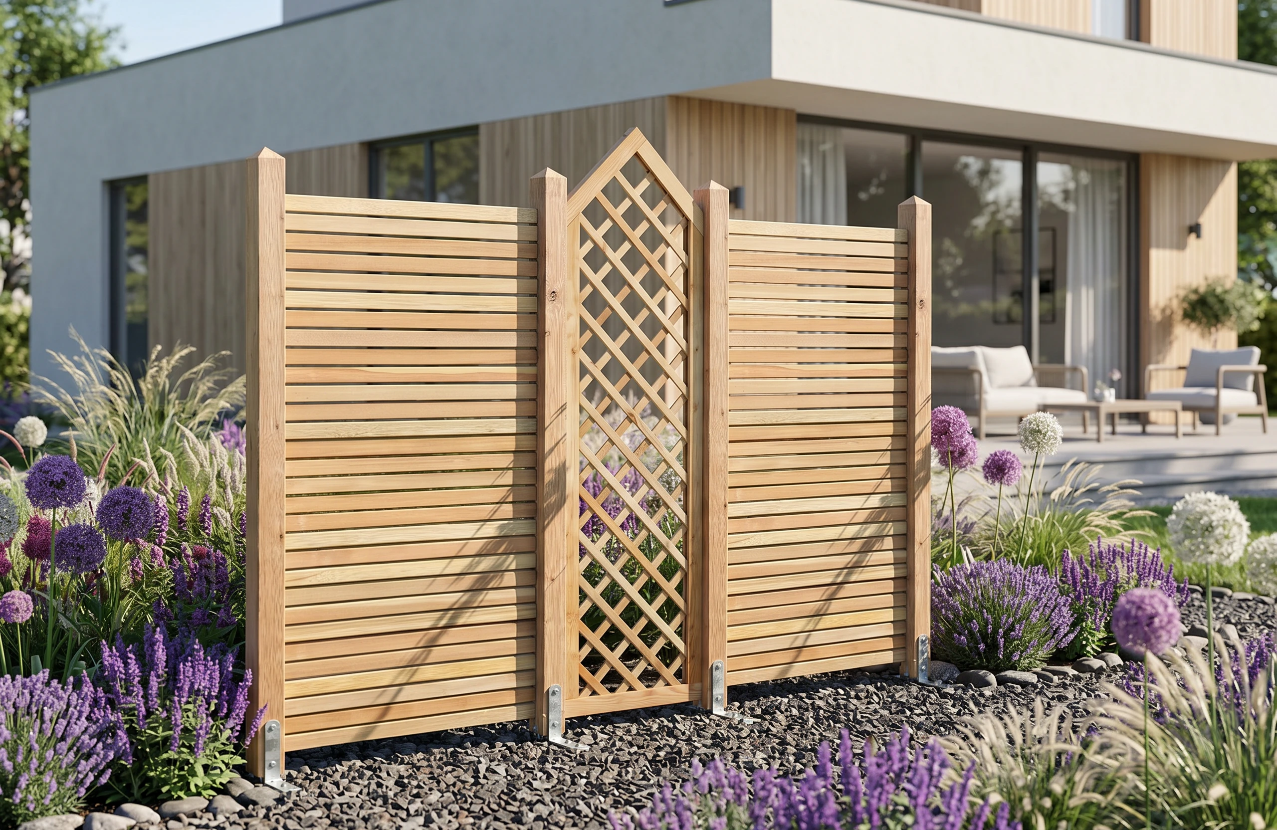 Passende Spaliere der Serie Vario aus sib. Lärche ergeben vielfältige Kombinationsmöglichkeiten.